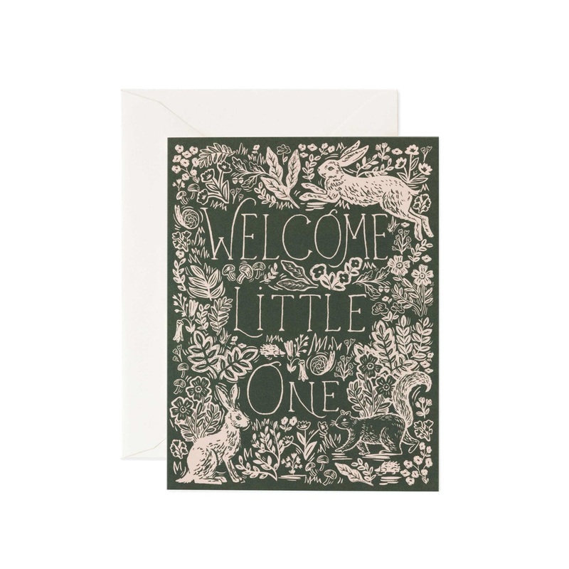 Celebrate the birth of a new legend with the old-fashioned charm and striking monochrome design of the Fable Baby card from Rifle Paper Co. This card is printed on FSC-certified paper.