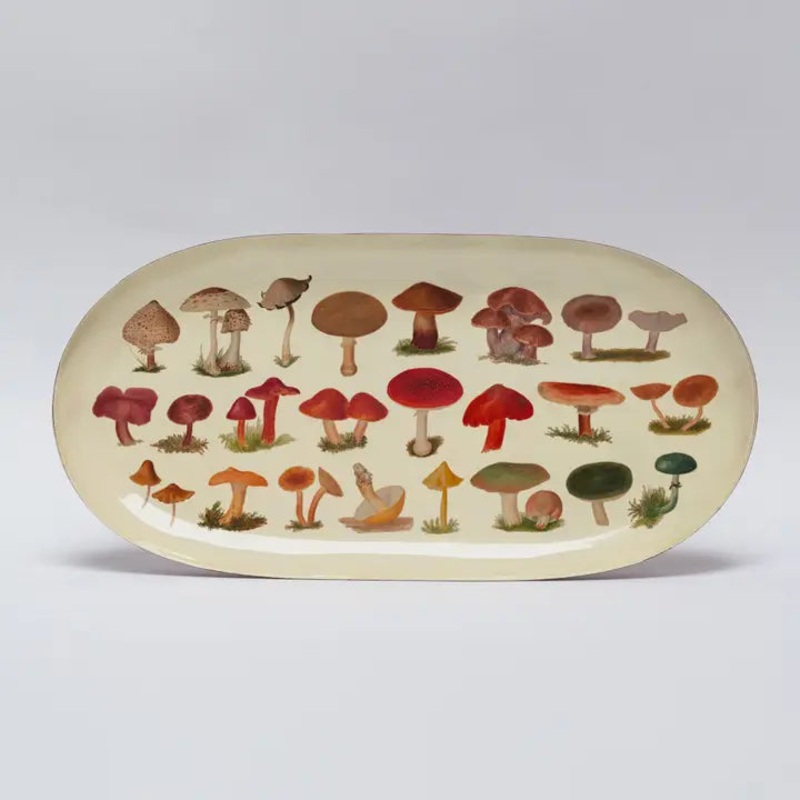Featuring artwork reproduced from incredible vintage drawings of fungi species from England and Wales dating back to 1860, this charming oval shaped decorative Fungi Enamel Tray is the perfect home accessory for holding stationery, jewellery, and other trinkets.