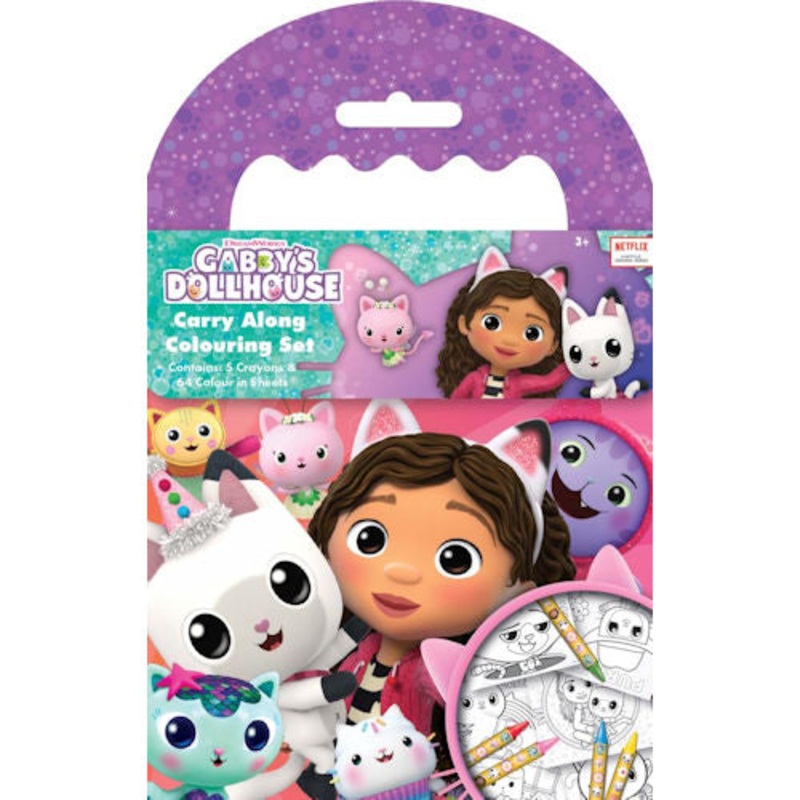 Title: Gabby's Dollhouse Carry Along Colouring Set Inclusions: Complete set includes 5 crayons and 64 colour-in sheets, providing everything needed for creative activities on the go. Usability: Ideal for long journeys, keeping children entertained and enga