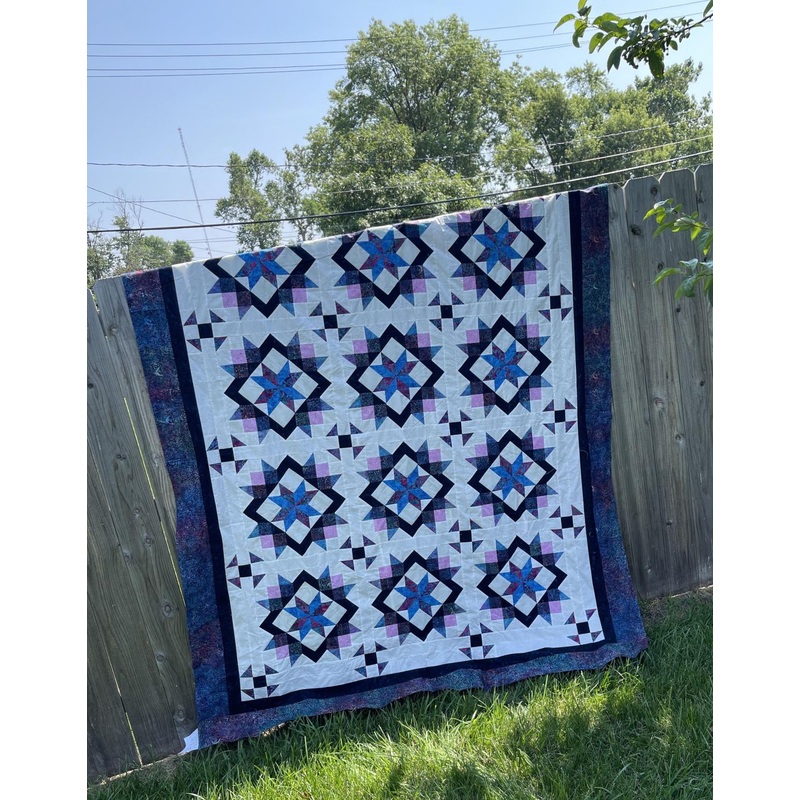 At 73″ x 91″, Garden Party is a generous sized batik beauty that is created with a single block repeated for the quilt. Pattern design by Charlotte has a chart that details location of each fabric to make cutting and sewing this quilt is done with ease . The kit includes all the fabric to make the quilt top and a coordinated border fabric that has enough yardage to cut borders length of fabric. Kit also includes coordinated binding.