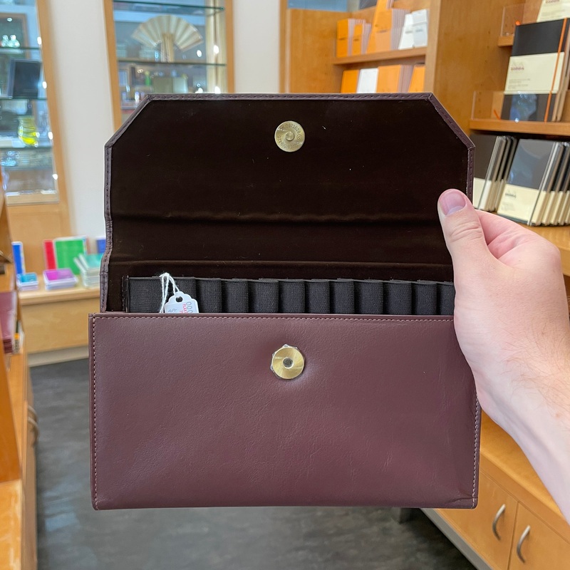 This leather pen clutch has been on of the most popular at Flax Pen to Paper. A sleek new take on the classic pen case. This pen case snaps closed and stays securely shut. Leather gusset allows you to reach into the clutch with ease. Soft interior. Elastic bands hold up to 12 pens. Available in other colors!