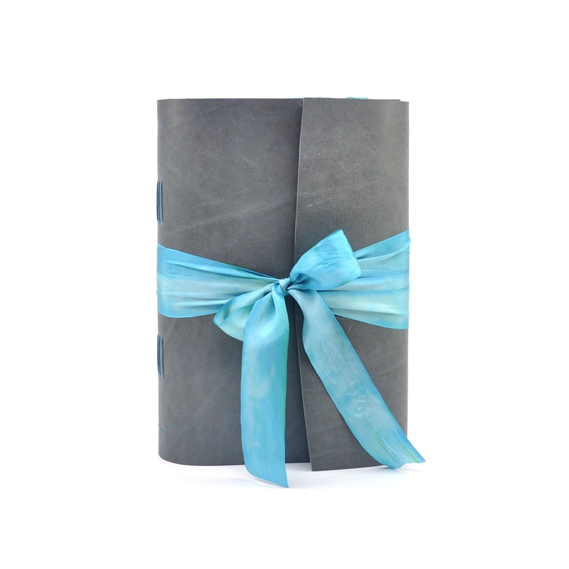 The journal is finished with a flap and a dip-dyed aqua ribbon that ties around the book block to hold the cover closed when you are not writing.