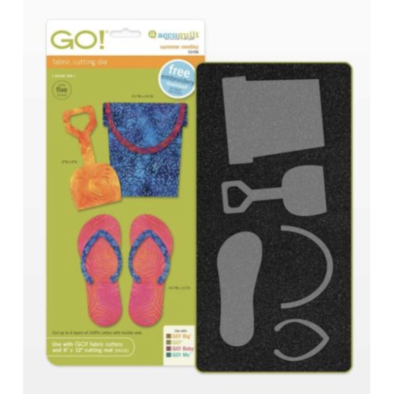 GO! 55496 Summer Medley Die. Lifes a beach with the Charm Pack-friendly GO! Summer Medley. Bring sun and sand to your quilting and sewing projects with the flip-flop style sandals, bucket and shovel applique shapes in the set. Cutting several is easy-breezy. Simply apply fusible web to the wrong side of fabric and cut four of each applique shape in one pass through your GO! cutter.