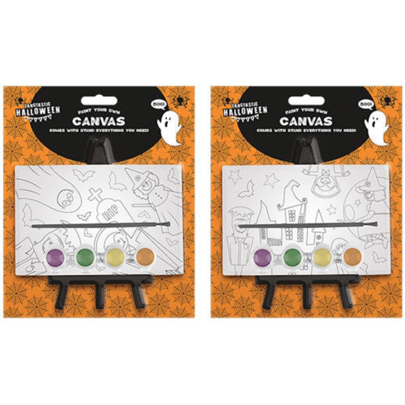 Halloween Paint Your Own Canvas With Stand: Get creative with Halloween-themed painting. Two Assorted Designs: Randomly selected for variety. All-Inclusive Kit: Includes paint, brush, picture canvas, and stand. Perfect for Halloween Parties & Celebrations:
