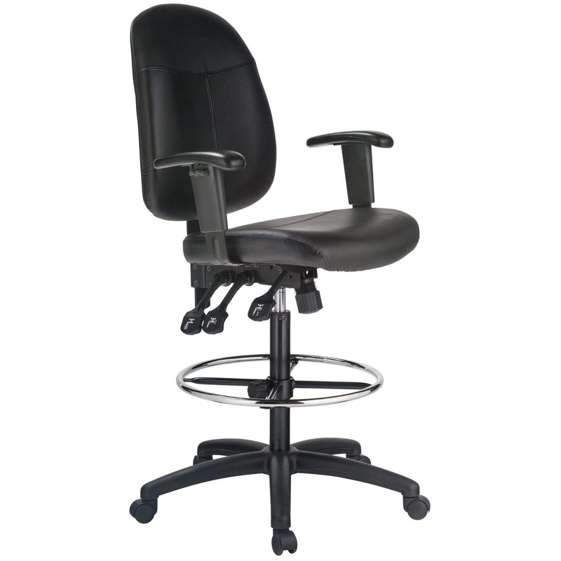 Introducing the Harwick multi-function ergonomic drafting chair, designed with both form and function in mind. This chair boasts a luxuriously contoured seat and back cushion, ensuring maximum comfort for those long hours at your desk. With its one-touch pneumatic seat height adjustment, you can easily find the perfect position to suit your workspace, while the tilt feature, complete with adjustable tilt tension, allows for customizable reclining support.