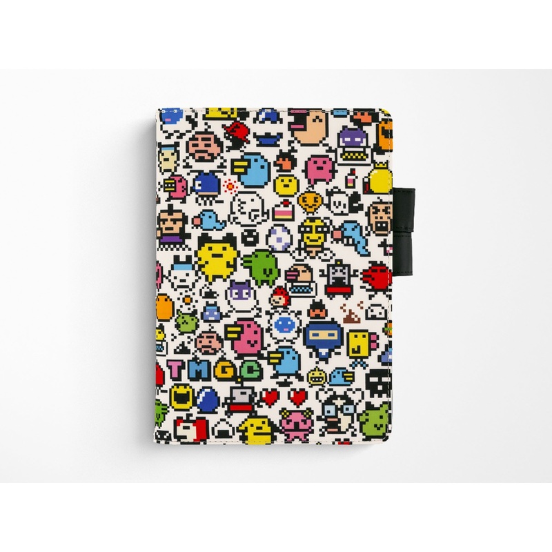 A cover born from a collaboration with the digital handheld pet,Tamagotchi. The tightly woven fabric is printed with a variety ofcolors. Of course you will find the Tamagotchi themselves, butthere are also food and snacks, hearts and poopsall kinds ofcharming icons depicted in a pixel art style. It has “butterflystopper” pen holders, which also function as a clasp to keep thecover shut.