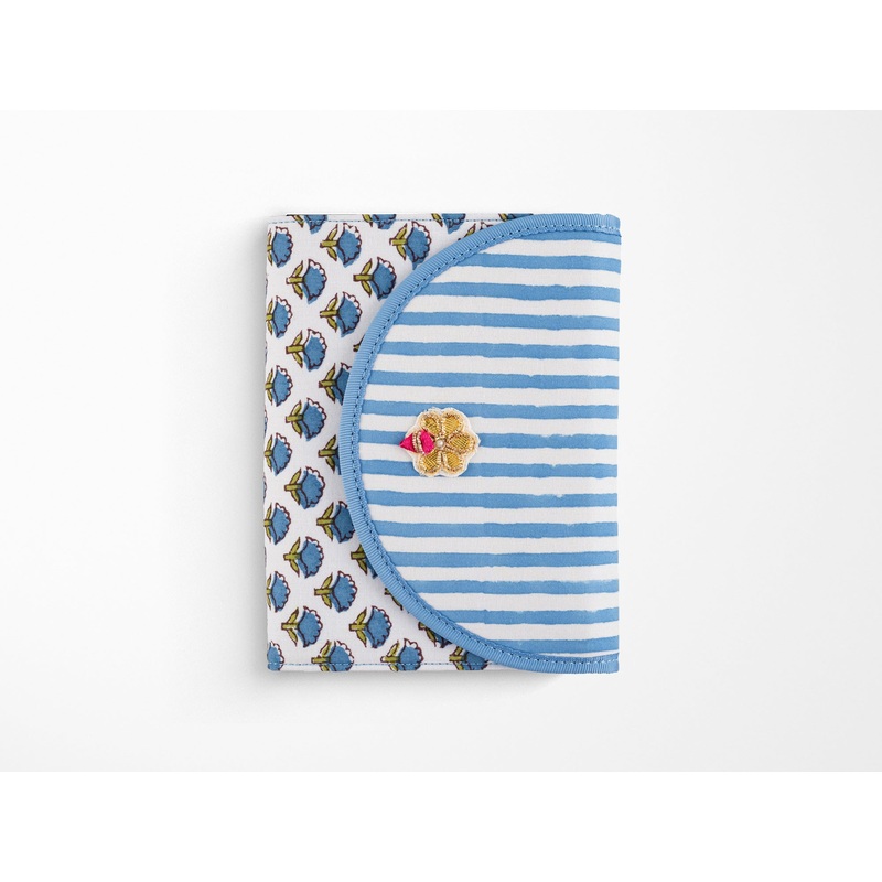 This cover is made with block-printed fabric from India. The blue color is beautiful. The center of the flap contains a pink charm from India. This tri-fold cover stays shut with a button and has an interior pen hook to store a pen by its clip.