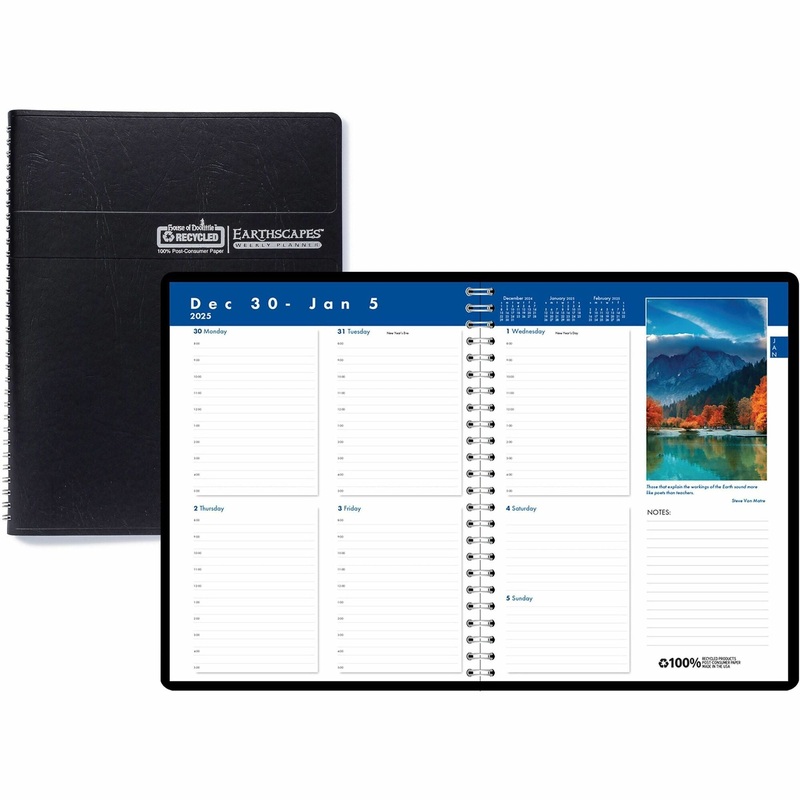 Enjoy nature scenes while scheduling your workweek appointments. Each one-week per two-page spread features a nature scene image, an inspirational quote and open note space. Printed monthly indicators help you quickly find the date you need. Black, embossed leatherette cover withstands daily use throughout the year. A reference calendar page details the current year and the next two full years, and an additional page lists all important holiday dates for three years. Made entirely of recycled materials. Size: 8 1/2 x 11; Page Color/Theme: Earthscapes; Appointment Ruling: 8 AM to 5 PM Mon.-Fri.; Edition Year: 2016.