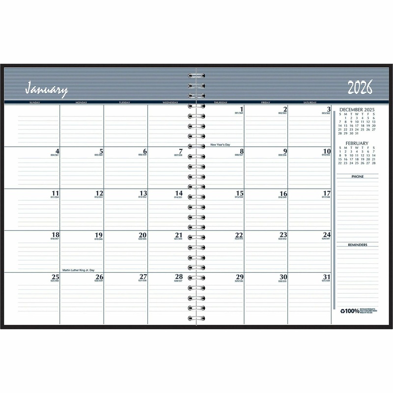 Wirebound monthly planner includes an expense log and 35 memo pages to track expenses and important notes. Embossed, simulated leather cover offers a professional look. Planning pages range 14 months from December to January. Two-page-per-month spreads include large, unruled daily blocks (1-1/2″ x 1-1/2″) for detailed notes; holidays; count of days/days remaining; Sunday-through-Saturday scheduling; a ruled notes area along the side; and past and future months reference near the top right corner. Nonrefillable planner is printed with soy ink on paper made with a high percentage of recycled material.