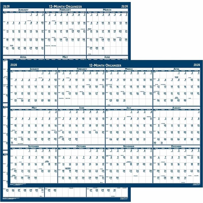 Eco-friendly wall calendar offers 12 months of dated planning from January through December in vertical and horizontal format. Write reminders, events and deadlines on laminated calendar and easily wipe off. Vertical calendar offers 1-1/8″ x 1-5/8″ daily blocks. Horizontal calendar has 1-1/4″ x 1-3/8″ daily blocks. Both sides include numbered weeks and count of days/days remaining. Wall calendar includes self-adhesive hangers and a water-soluble marker. Paper is made with a high percentage of recycled material.