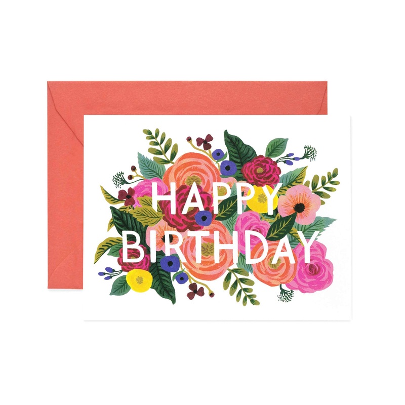 Make your birthday greetings burst with floral vitality with the vibrant Juliet Rose Birthday card from Rifle Paper Co. This illustrated card is blank inside and comes with its own high quality envelope. All Rifle Paper Co products are printed on high quality FSC-certified paper stocks.