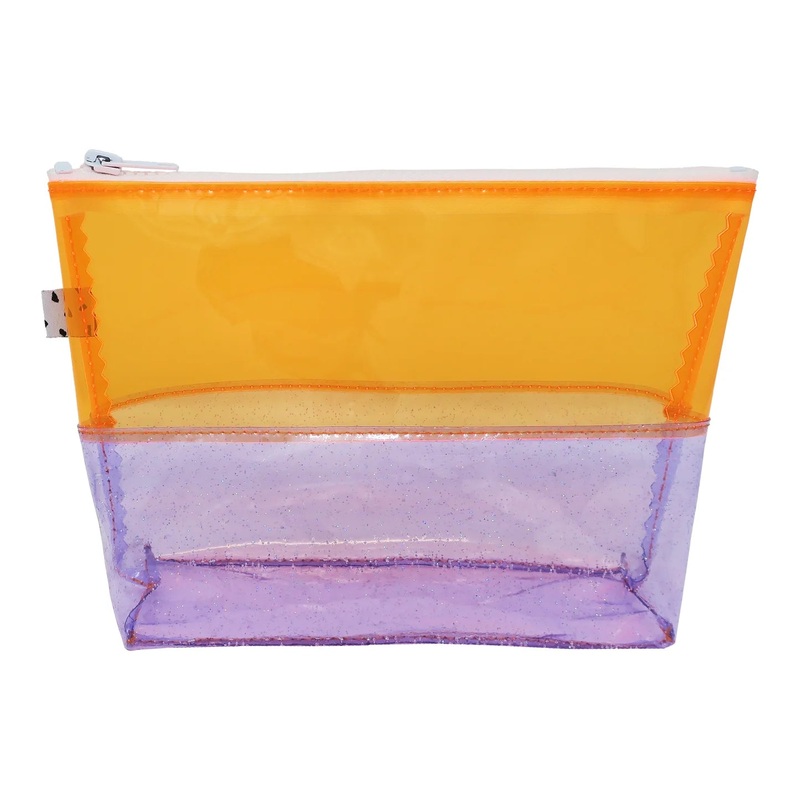 This is the perfect toiletry bag! Great for traveling or just keeping your bathroom products organized in one place. This orange and purple glitter transparent vinyl pouch has a perfect chunky pink zipper for stashing whatever your heart desires.