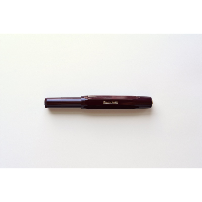 Kaweco CLASSIC Sport Fountain Pen – Bourdeaux. Based on the original 1911 concept of Kaweco Sport pens that were designed to be portable and convenient-to-carry fountain pens, the Kaweco CLASSIC Sport fountain pens are a perfect little pocket fountain pen. Capped, the pen is about 4 inches long, and when uncapped and writing, with the cap placed on the backside of the pen, the pen is lengthened to be about 5 inches, giving it a comfortable size and balance in the hand. With Kawecos signature octagonal pen barrel, the CLASSIC Sport fountain pens sit easily in your hand when you are writing and are able to lie flat on a desk without rolling around. We love all the bright and fun colors that the CLASSIC Sports come in, the easy and lightweight design of the barrel and the gold lettering and detailing on the pen. In the store, when we are asked to recommend a starter fountain pen, the CLASSIC Sport fountain pens are one of the pens we always suggest you try out.
