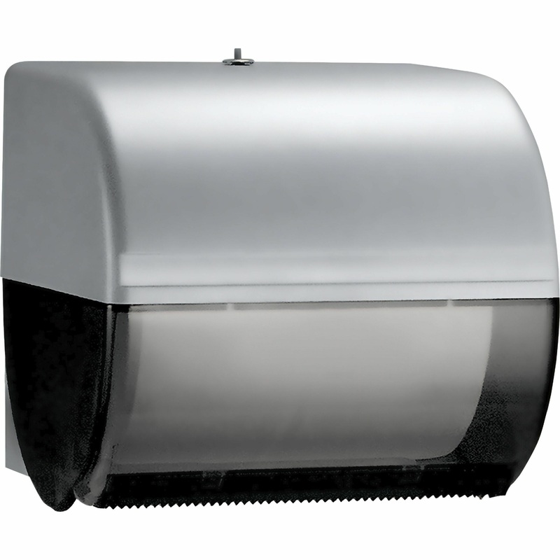 Omni Paper Towel Dispenser features a compact, efficient design for space-saving use in areas with limited wall space while still holding up to 1,000′ of roll paper towels. Touchless dispensing allows your guests to choose the length of paper towels they need, all while touching only the towel they use. Nonrestrictive construction allows users to take the length of sheet that’s desired. Easy-loading system makes refilling quick and simple to reduce maintenance times. Locking cover prevents unauthorized access to reduce pilferage. Stainless steel internal parts reduce corrosion for long-lasting, hygienic use. Dispenser is designed for compatible Kleenex and Scott paper towels (sold separately). When installed properly, this dispenser meets the ADA standards for accessible design, 28 CFR Part 36.