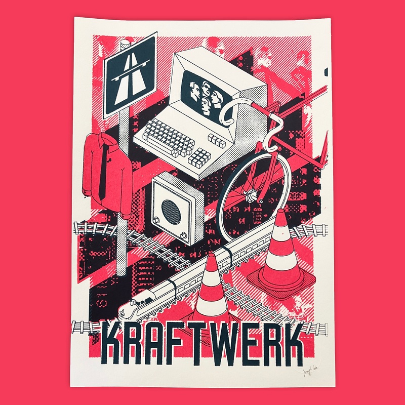 A hand pulled screen print of Joseph Cox's 'Kraftwerk' design. Featuring a reference to each one of the studio albums from the band. Please note that being a screen print there can be slight variations in each different print, we think this is the charm of