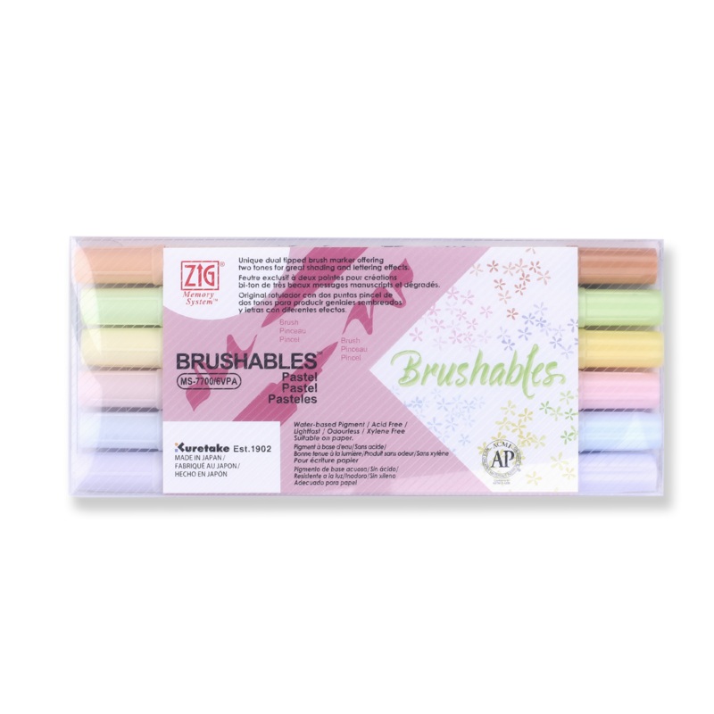 The Kuretake ZIG Brushables Brush Pen Set includes six pigment brush pens that are water-based. Its distinguishing features include lightfast and acid-free ink and dual-tipped markers that are similar in color but dark and light in different ways. It has a