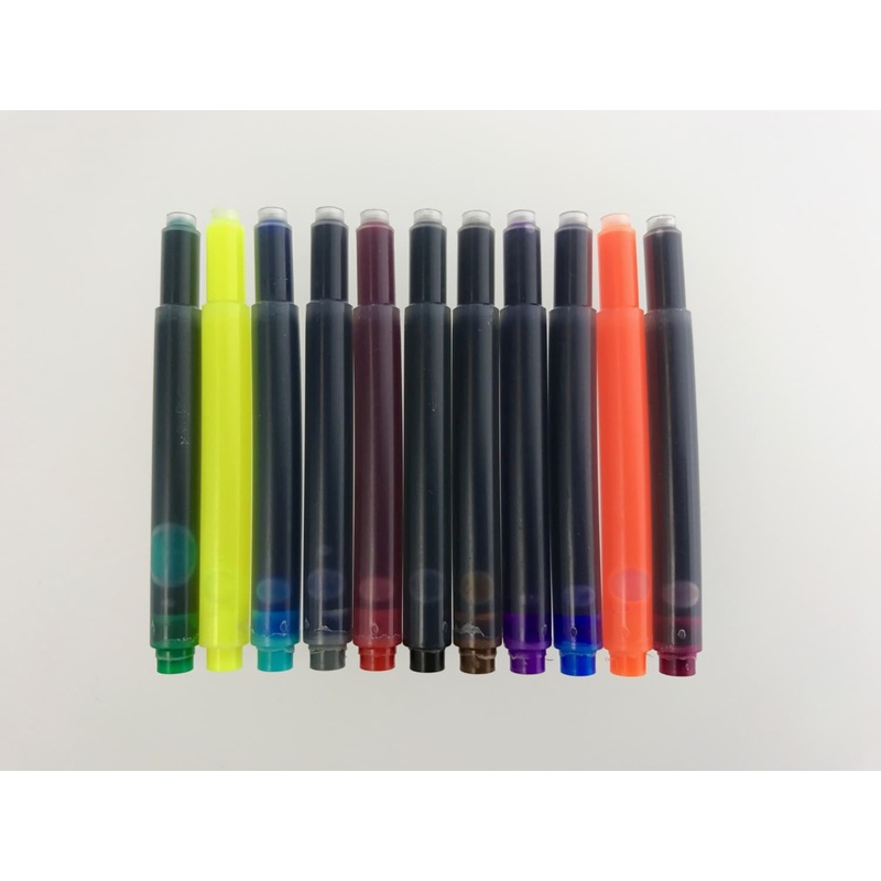 Lamy Fountain Pen ink cartridges in yellow, turquoise, red, purple, orange, green, burgundy, black, blue-black, and blue.