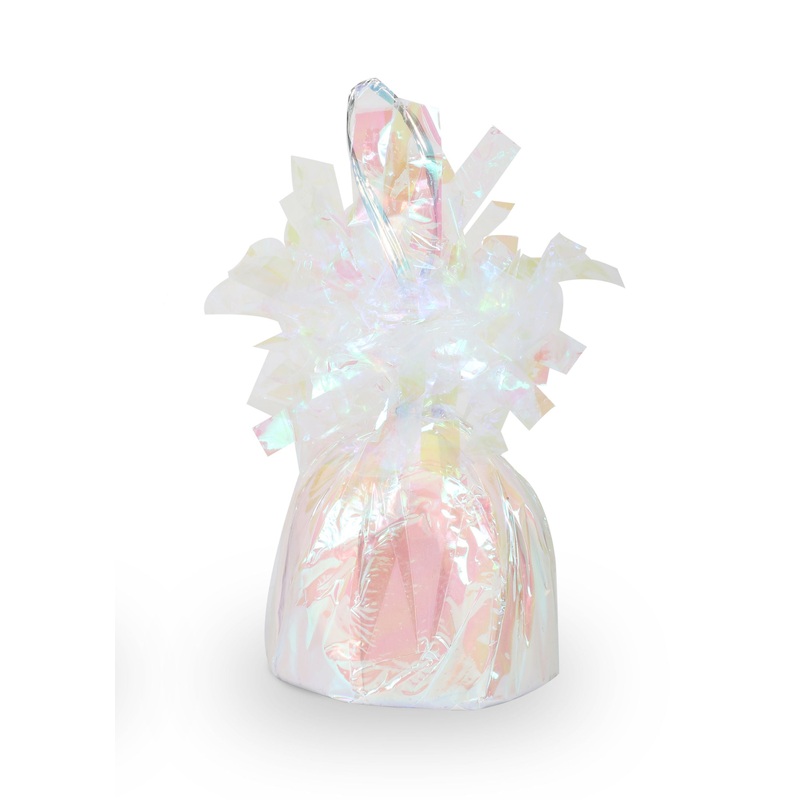 Colour: Iridescent Weight: 160g Decorative Function: Perfect for adorning tables and securing helium balloons, creating a dazzling and enchanting atmosphere for your event. Premium Quality: Crafted from durable metallic foil, this balloon weight ensures re