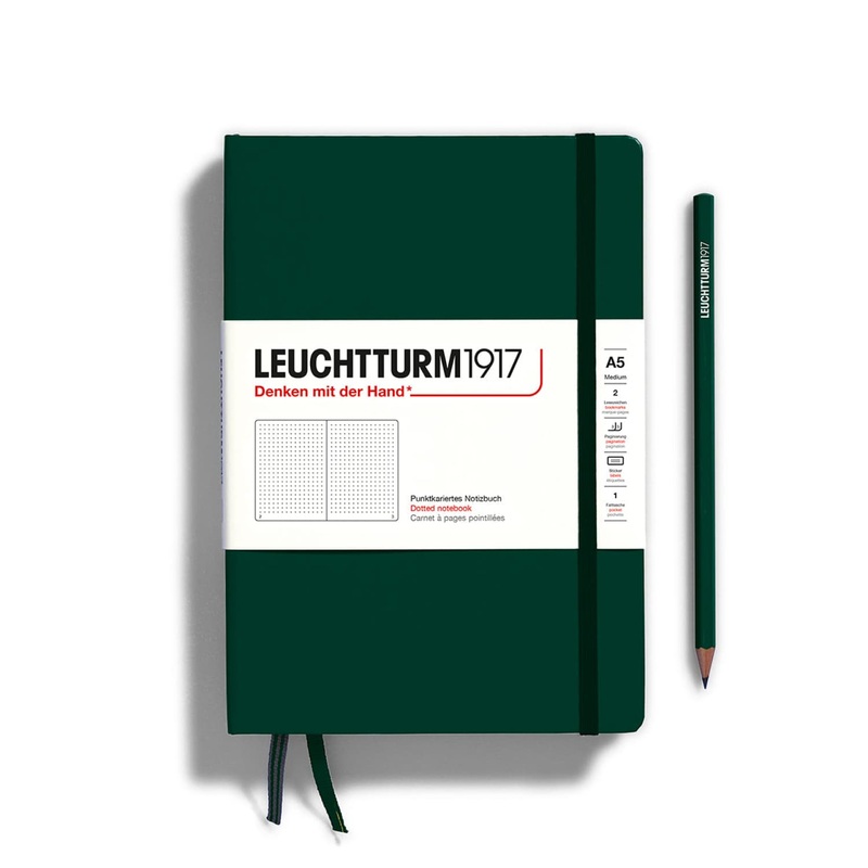 Leuchtturm1917 Medium Hardcover Dotted notebooks (A5 size) have 80g paper and 249 numbered pages. Everyone can enjoy their size and range of colors. Find the perfect notebook from a choice of many different colors.Leuchtturm1917Forest Green Medium Hardcove