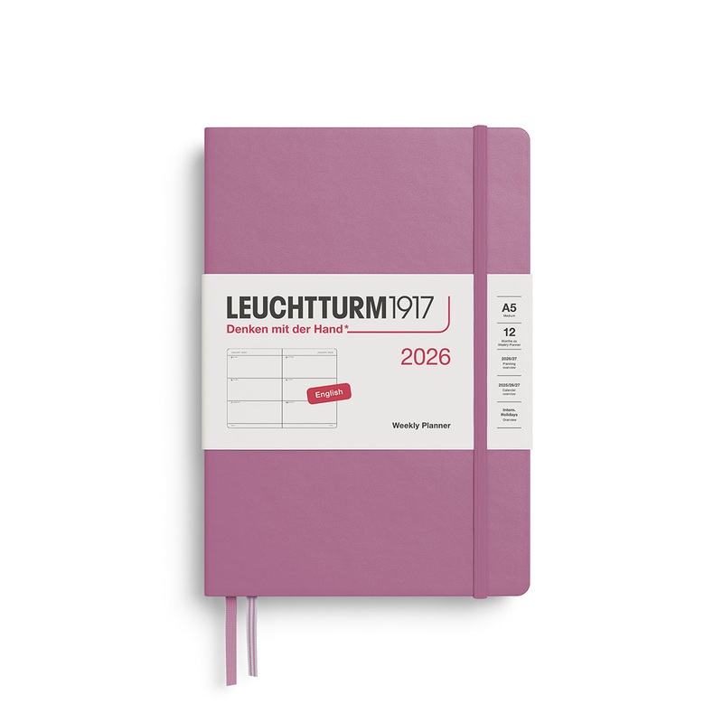 The LEUCHTTURM1917 weekly planner. In the weekly planner, a week is shown across a double page. Each day has its own box, Saturday and Sunday share a box. The days are printed from top to bottom and left to right.