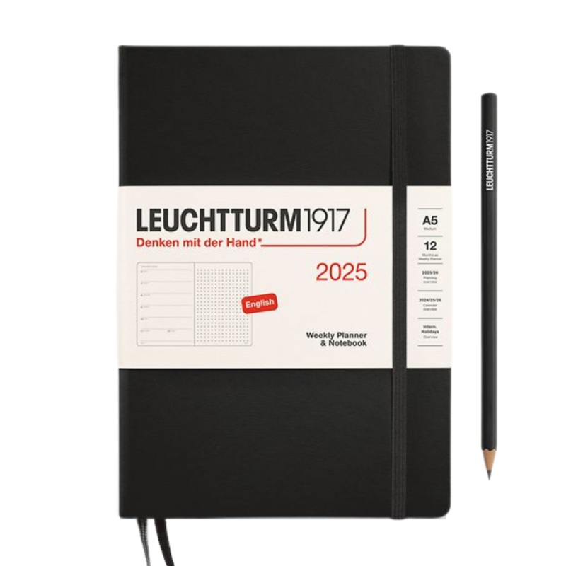 Leuchtturm1917 A5 Medium Hardcover Weekly Planner & Notebook 2025 - Dotted / BlackExperience seamless organization with the Leuchtturm1917 A5 Medium Hardcover Weekly Planner & Notebook in Dotted Black for 2025. This versatile planner merges your weekly sch