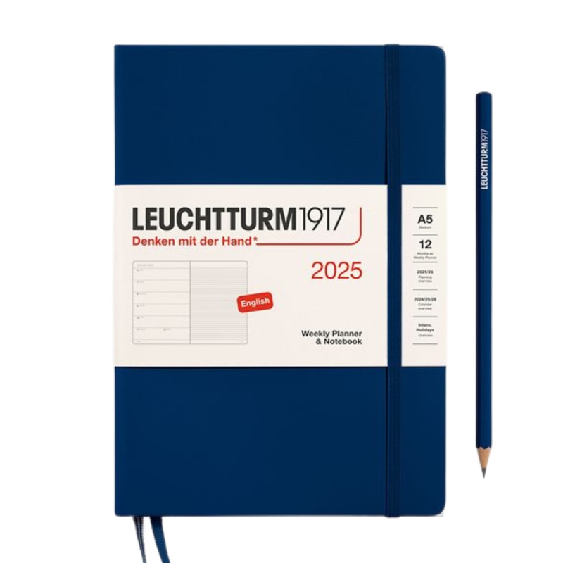 Leuchtturm1917 A5 Medium Weekly Planner & Notebook 2025 - NavyStay organized and stylish with the Leuchtturm1917 A5 Medium Hardcover Weekly Planner & Notebook in Navy for 2025. This sophisticated planner combines functionality with a classic design, provid