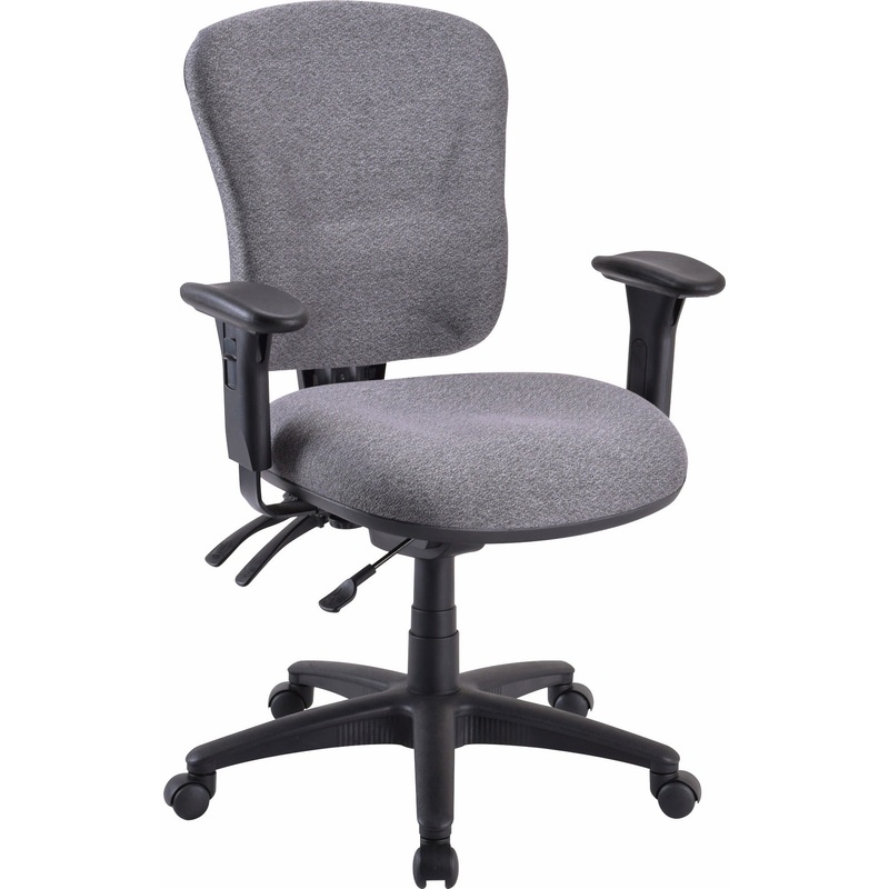 Mid-back task chair features adjustable arms and molded foam, contoured seat and back that provide long-lasting comfort. Waterfall seat provides under-thigh support. Arms adjust in width from 18" to 19-1/2". Functions include pneumatic seat-height adjustme