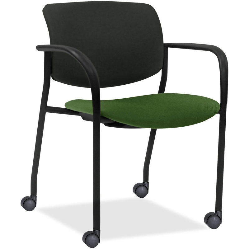 Contemporary stacking chair with hooded casters features a heavy-duty tubular steel frame for reliable use in your reception area, training room, office or conference room. Frame is powder-coated in black for durability. Fern Green Crepe-upholstered seat, black plastic back and soft-touch polyurethane arms provide superior comfort and support. Chair also includes a four-leg base, wall-saver design and nonmarring floor glides. Stack this chair with others like it up to four chairs high freestanding and up to 10 high on a stacking dolly. Weight capacity is 300 lb. Chair exceeds ANSI/BIFMA standards and is Greenguard Certified.