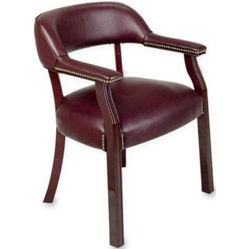 This traditionally styled barrel-back captain's chair from Lorell is ideal for any guest or reception area, or waiting room.Features: Thickly padded seat cushionBrass nail head trim that lines the upholstered arms and front of the chairFour post mahogany f