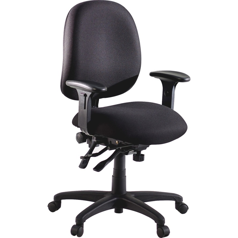 High-performance, ergonomic task chair features a contoured seat and back with built-in lumbar support as well as a sturdy metal frame. Built-in arms adjust in height from 7" to 9" and in width. Functions include pneumatic seat-height adjustment from 16-1/