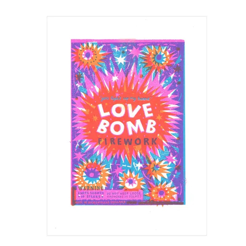 A love bomb firework illustration by The Printed Peanut. A vibrant 3 colour riso print to brighten up your wall. Risograph prints vary from print to print, making each one unique in texture and depth of colour. Printed in the UK using eco-friendly inks onto 100% recycled white card.