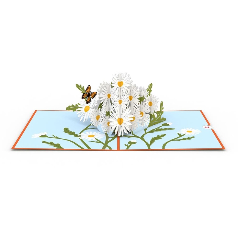 The cover of this fun pop-up card is bright orange and features two white daisies and a few little fluttering butterflies. Once opened, a delicate daisy patch cluster fills the center of the card, with a dainty orange monarch butterfly resting on one of th