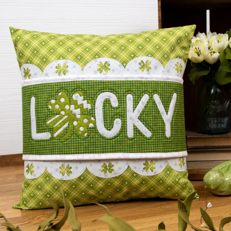 The Lucky Pillow Wrap & Cover Kit features instructions for the pillow wrap and cover, pre-cut fused applique, notions, fabric, single-sided fusible foam batting, and twill tape for the pillow cover and wrap.