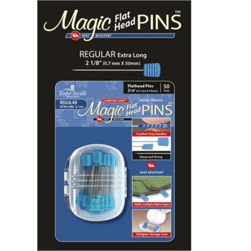 Flat head pins regular 2 1/8 in ( 0.7 mm x 50 mm) Heat reistant Confort Grip handles. Sharp and strong. Holds multiple fabric layers. Designer storage case.