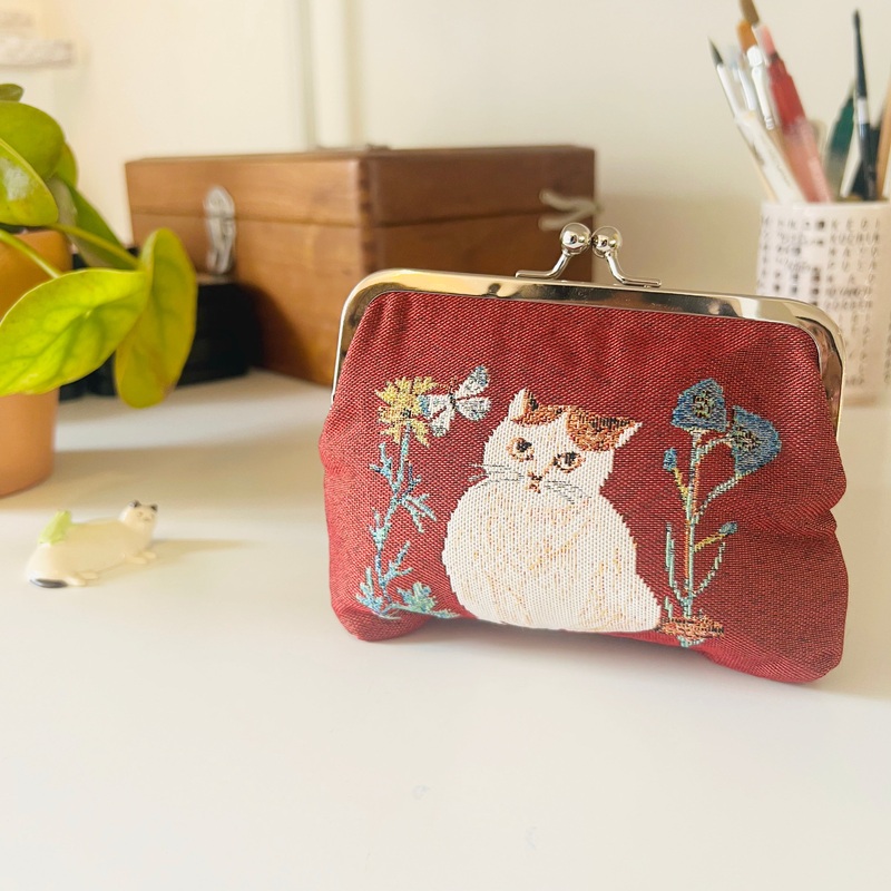 The cats drawn by Miyuki Matsuo have been woven into this pouch. The cats with their unique expressions are incredibly cute, and when combined with the plants, it creates an eye-catching design. It can be used for a variety of purposes, such as storing cosmetics and cards, or as a wallet. It is also a recommended item for small gifts.