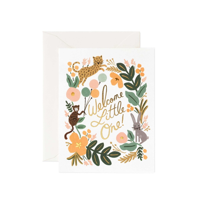 The Menagerie Baby Greeting Card from Rifle Paper Co. features a delightful hand-illustrated design full of sweetness and charm to welcome a new arrival in style.