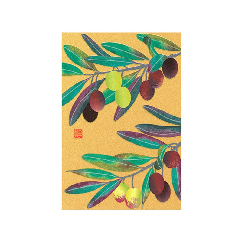 Midori Autumn postcard series features bold, vibrantly colored "olives" on textured Echizen washi paper.148 x 100mm Echizen washi paper1 PostcardBlank on reverse side