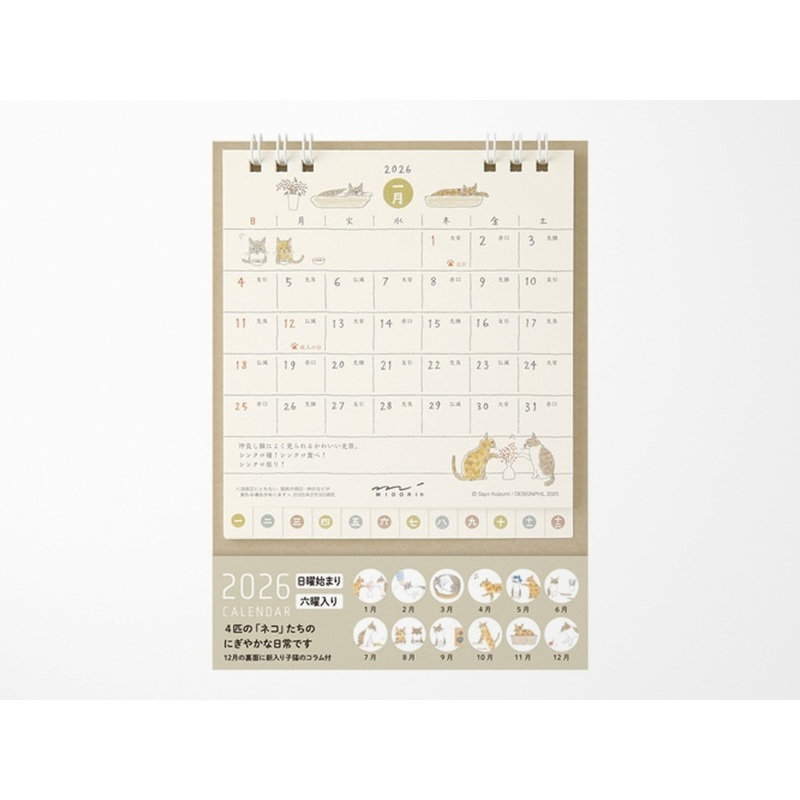 Midori 2026 Cat Small Desk CalendarThis desk calendar lets you enjoy the changing seasons with cats. The illustrations change every month, making it a fun and enjoyable calendar to use. It's also perfect for office use. It includes an index, making it smal