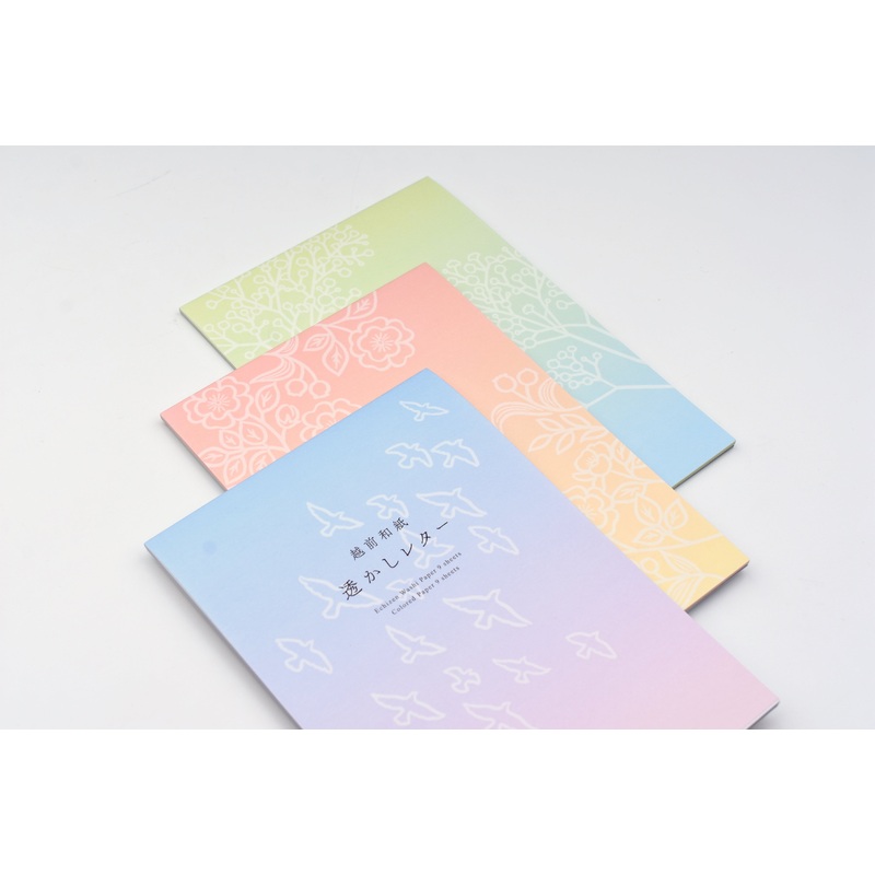 Midori Watermark Letter Pads include 9 soft colored paper and 9 white Japanese traditional washi paper with watermarked design on them. The translucent watermark patternappears whenthe washipaper is placed over colored paper,giving this soft colored Letter