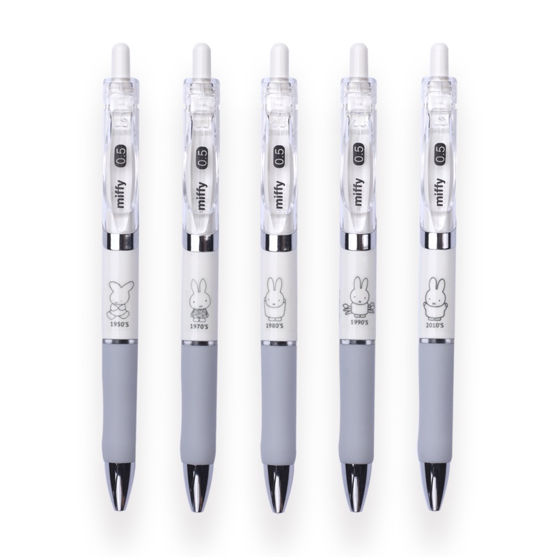 Check out the Miffy Limited Edition Gel Pen Set of 5, perfect for any stationery lover. This special set includes five writing pens, each decorated with different cute Miffy designs. These Miffy pens have a fine 0.5mm tip and a soft rubber grip, making wri