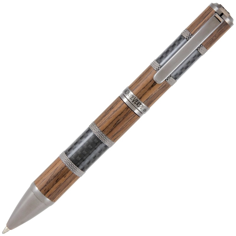 This Walnut edition features a natural walnut wood finish, with dark wood grain throughout each segment, beautifully paired with shiny gunmetal trim. A metal coin sits atop each pen with the famous Monteverde mountains.