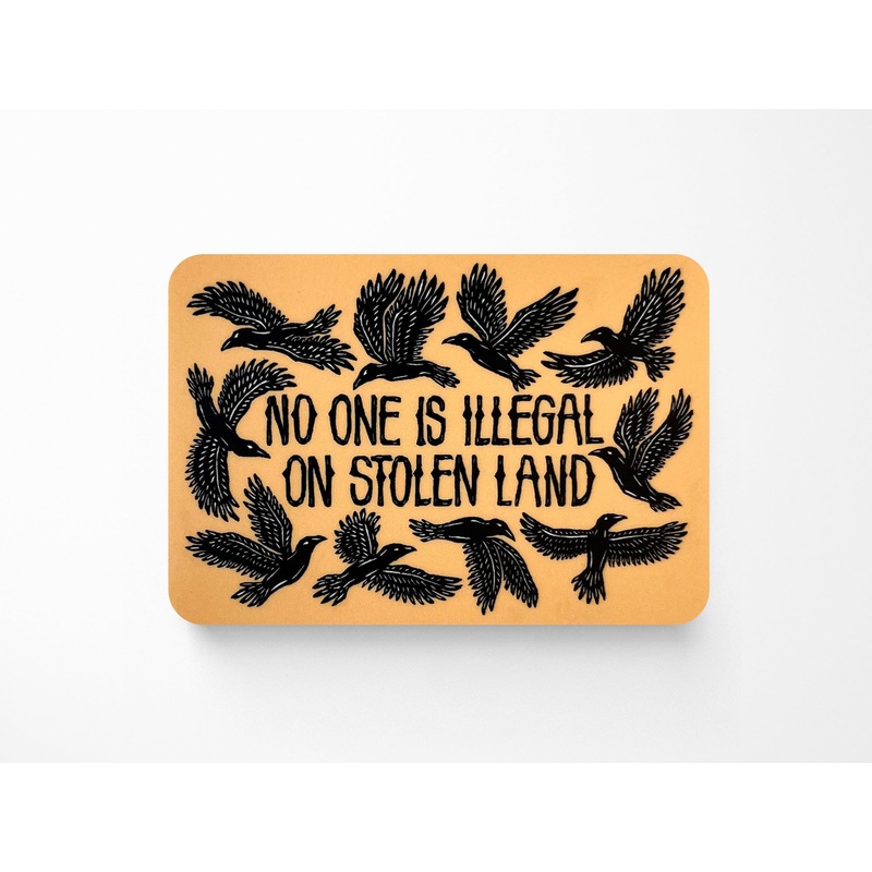 "No One Is Illegal On Stolen Land." From an original image made by carving linoleum block, hand printing, editing for color stickers produced professionally.10% of proceeds are donated to Indigenous Women Rising.Thickwaterproof vinylSize approx:4.3" x 3"Wa