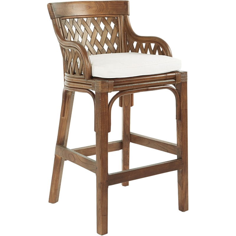 Introducing the Plantation Bar Stool - the perfect addition to any dining or kitchen area. This stool has a jungle-inspired design with a rattan wicker frame and woven back panels made of embossed bamboo. It also has solid wood support and a cotton duck fo