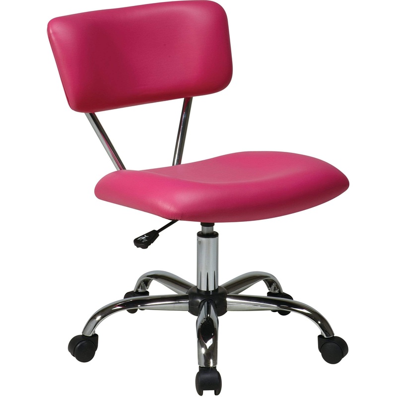 Features:Padded Vinyl Seat and BackOne Touch Pneumatic Seat Height Adjustment360? Swivel Heavy Duty Chrome Finish Base with Dual Wheel Carpet Casters Intended for Residential Use OnlyOuter Materials: Vinyl / Chrome Fabric: Vinyl PVCFinish: PinkDimensions: