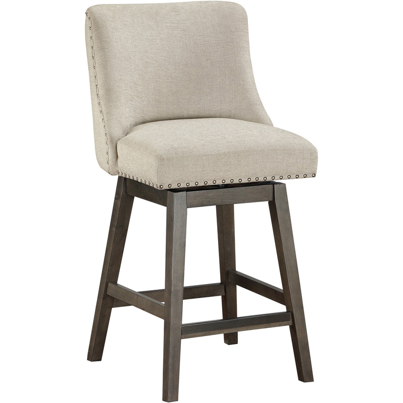 Enjoy the comfort and beauty of a modern, contemporary design with this counter stool. It’s perfect for a kitchen island or any casual eating area that’s counter-height. The padded back and seat are well-positioned and detailed with tailored nailhead trim, making it an essential solution for active seating. With full swivel motion, you can easily converse and eat with ease. The stool is made with 100% polyester fabric, which is dependable, and the solid wood frame ensures durability and beauty. Assembly is required.