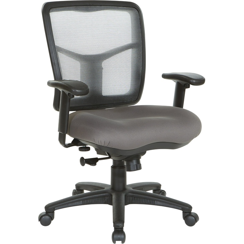 Experience enhanced productivity and comfort with the Mesh Back Chair with Fabric Seat from Pro-Line II. The chair comes with a Breathable Air Mist mesh back that provides continuous support, keeping you cool and comfortable throughout the day. The FreeFlex II fabric seat is designed to provide cushioned comfort as you organize your day. This chair is adjustable to fit your unique needs, with features like one-touch pneumatic seat height adjustment, 2-to-1 synchro tilt control with adjustable tilt tension, ratchet-back height adjustment, and height-adjustable arms. The heavy-duty nylon base with dual-wheel carpet casters ensures that you can move around your workspace with ease. This smart chair is perfect for anyone looking for a comfortable and adjustable work chair.