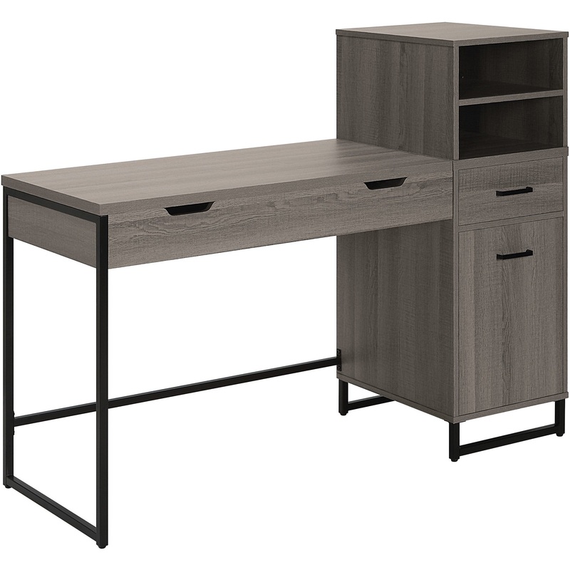 You can adjust the desk to three different heights: the lowest position is ideal for classic desk work, the mid-position is perfect for projects and drawing, and the upper position is great for standing. The desk also features a side hutch with two open shelves for convenient storage, a desk drawer, and a 2-shelf cabinet for additional supplies. There are also integrated interior storage compartments to keep little things out of sight and your workspace tidy and organized.