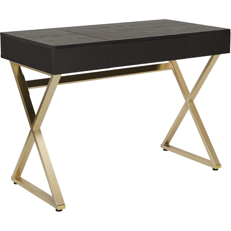 In desk power stationFlip top side panel and pull out drawer for extra storageLuxurious gold plated X leg baseWood veneers with black finishFor Use Type: Residential Use OnlyColor: Black Top/Gold LegsWeight capacity: 50Greenguard Certified: NoShips in: 2-3