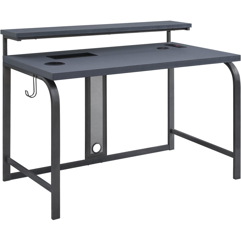 Enhance your gaming experience with the Reload 48″ Gaming Desk. The elevated monitor shelf is positioned at an ideal viewing height to reduce neck, shoulder, and eye fatigue. The spacious 48″ lower surface provides ample room to accommodate all your gaming gear. Immerse yourself in your gaming experience with customizable RGB LED lights. You can even position your wireless charging pad and USB power port according to your preferences. Keep your eyes on the game with the strategically placed device holder and accessory tray. With the integrated storage and power cable management system, you can keep your area distraction-free and effortlessly transition from gaming to working. The sturdy steel construction frame with a sleek carbon fiber finish surface ensures years of competitive enjoyment. The headphone hook and drink holder complete this winning choice.