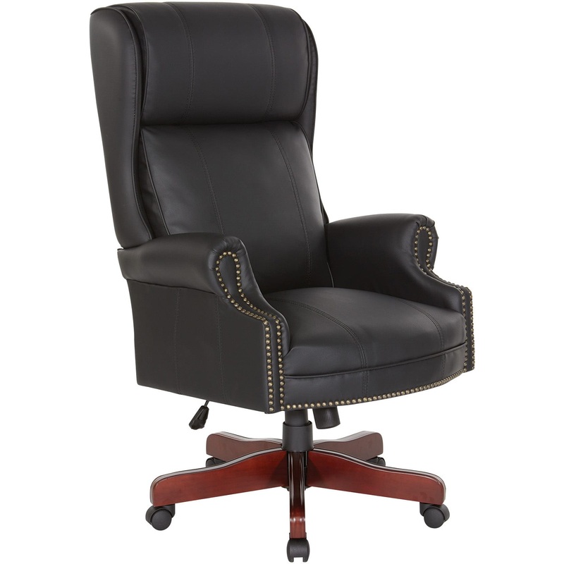 This Executive Highback Chair is a perfect blend of tradition and modern comfort. It features a classic design with a wingback, integral cushion headrest, fully upholstered armrests, and brass finish nail trim, giving it a vintage look. The chair is thoughtfully crafted with an extra-thick seat and back cushioning, providing exceptional comfort. The smooth upholstery is complemented with vertical double-needle stitching, which adds to its tailored appearance. The chair has a one-touch pressurized seat height adjustment, locking tilt control, adjustable tilt tension, and oversized wheel carpet casters that make it easy to move around. The metal base is of high quality and has wood caps in a Royal Cherry finish. Overall, this chair is an excellent option for those looking for a comfortable and stylish chair that brings a touch of history to their workspace.